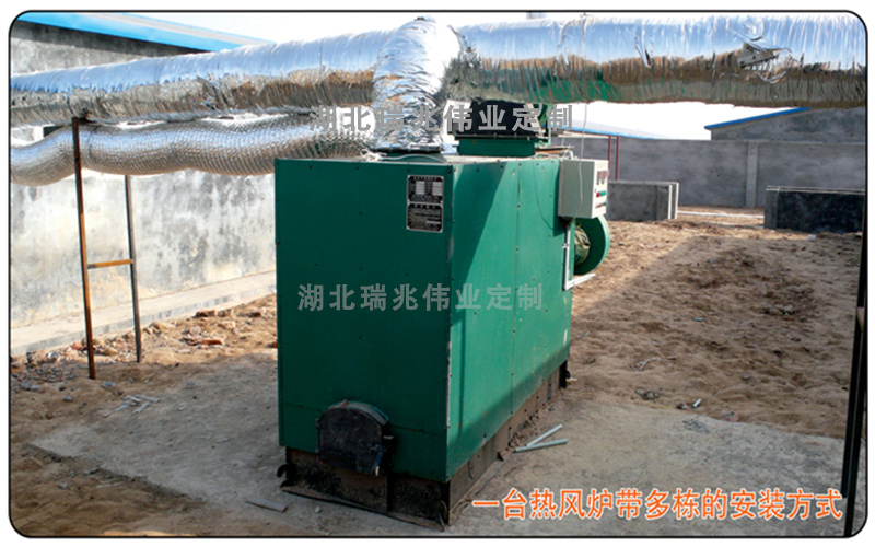 熱風(fēng)爐的安裝位置及管道布置方式可根據(jù)實(shí)際情況確定,可以安裝在畜禽舍的一端,兩側(cè),或者中間。 風(fēng)道長(zhǎng)度從爐開(kāi)始一直到畜禽舍的后端5-10米,設(shè)置在畜禽跨度的中間或略微偏一點(diǎn)的位置。 風(fēng)道高度以不礙事為準(zhǔn),一般在1.8-2.5米之間。直徑30或40公分,前10-15米用鍍鋅管制作,無(wú)散風(fēng)口。 后面用牛筋布制作,兩側(cè)120°交錯(cuò)分布可開(kāi)閉散風(fēng)口。 甚至可以選擇一臺(tái)爐帶一大間或兩小間畜禽舍的安裝方式。在一臺(tái)爐帶多間畜禽舍時(shí),畜禽舍的溫控通過(guò)控制風(fēng)閥的開(kāi)閉(自動(dòng)或手動(dòng))來(lái)實(shí)現(xiàn),這樣無(wú)論舊畜禽舍改造或新畜禽舍建造,都能達(dá)到很好的供暖效果。