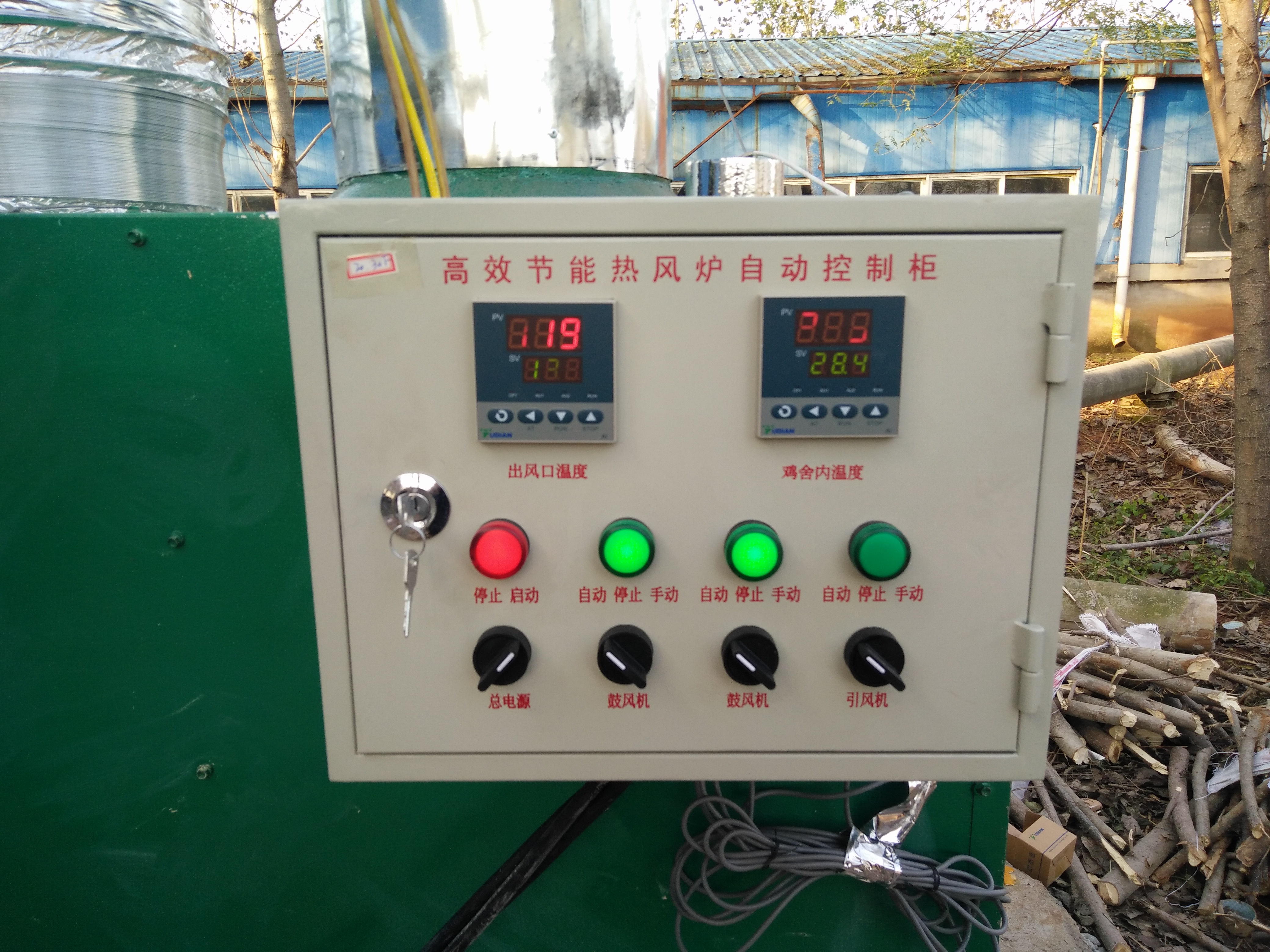 畜禽舍內(nèi)溫度在達(dá)到設(shè)定的溫度時(shí),熱風(fēng)爐自動(dòng)壓火。 在低于設(shè)定的溫度時(shí),熱風(fēng)爐自動(dòng)提火。 高溫自動(dòng)保護(hù):在出風(fēng)口溫度超過(guò)允許的溫度時(shí),熱風(fēng)爐自動(dòng)壓火,在降到正常的溫度后,熱風(fēng)爐自動(dòng)提火。 風(fēng)機(jī)自動(dòng)控制:點(diǎn)爐時(shí),出風(fēng)口溫度高于要求的溫度,鼓風(fēng)機(jī)自動(dòng)啟動(dòng);停爐或壓火時(shí),出風(fēng)口溫度低于要求的溫度,鼓風(fēng)機(jī)自動(dòng)關(guān)停。 每天只需簡(jiǎn)單的設(shè)定畜禽舍內(nèi)所需要的溫度,鼓風(fēng)機(jī)和引煙機(jī)的工作均根據(jù)溫度自動(dòng)控制。