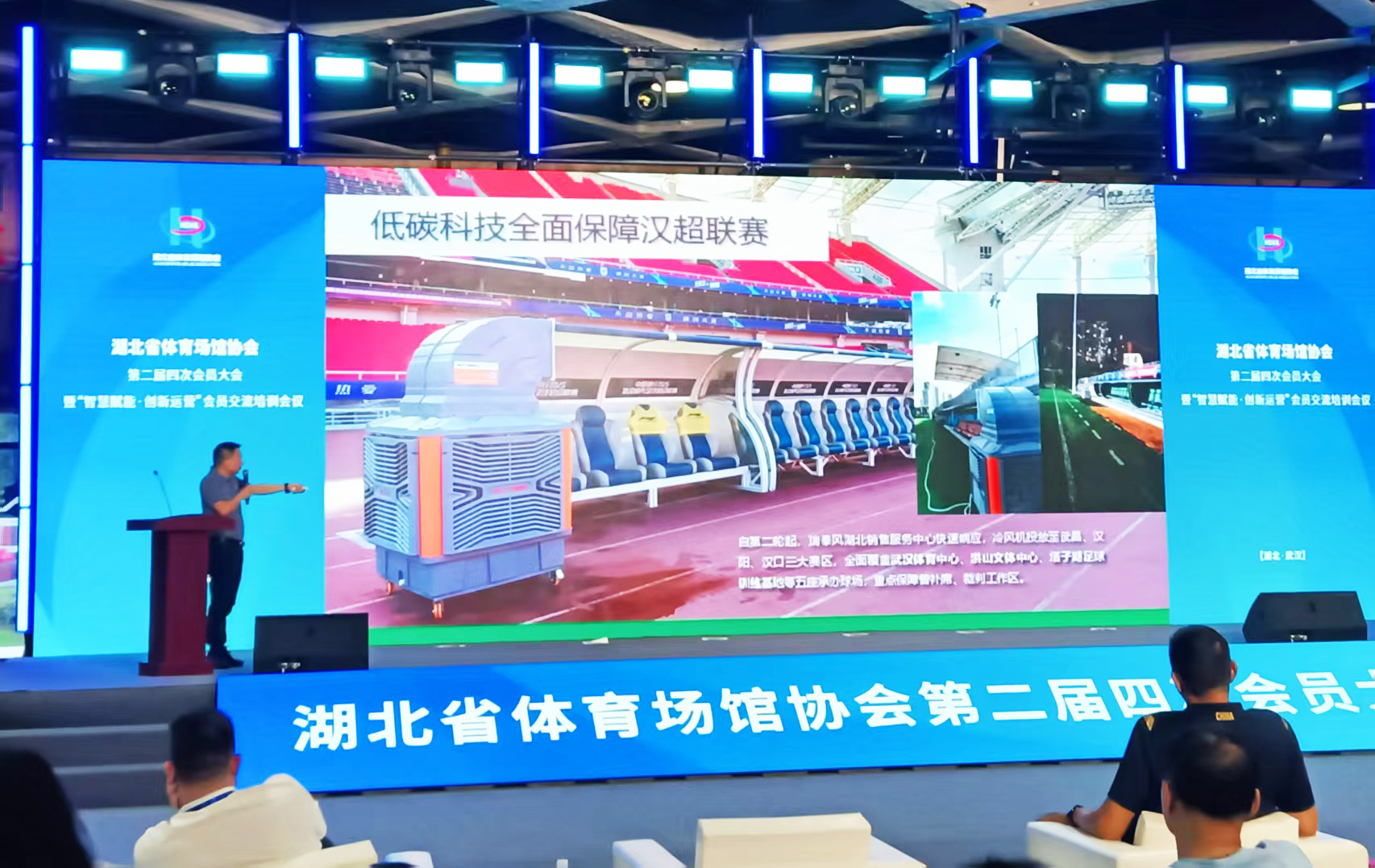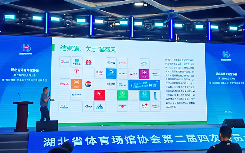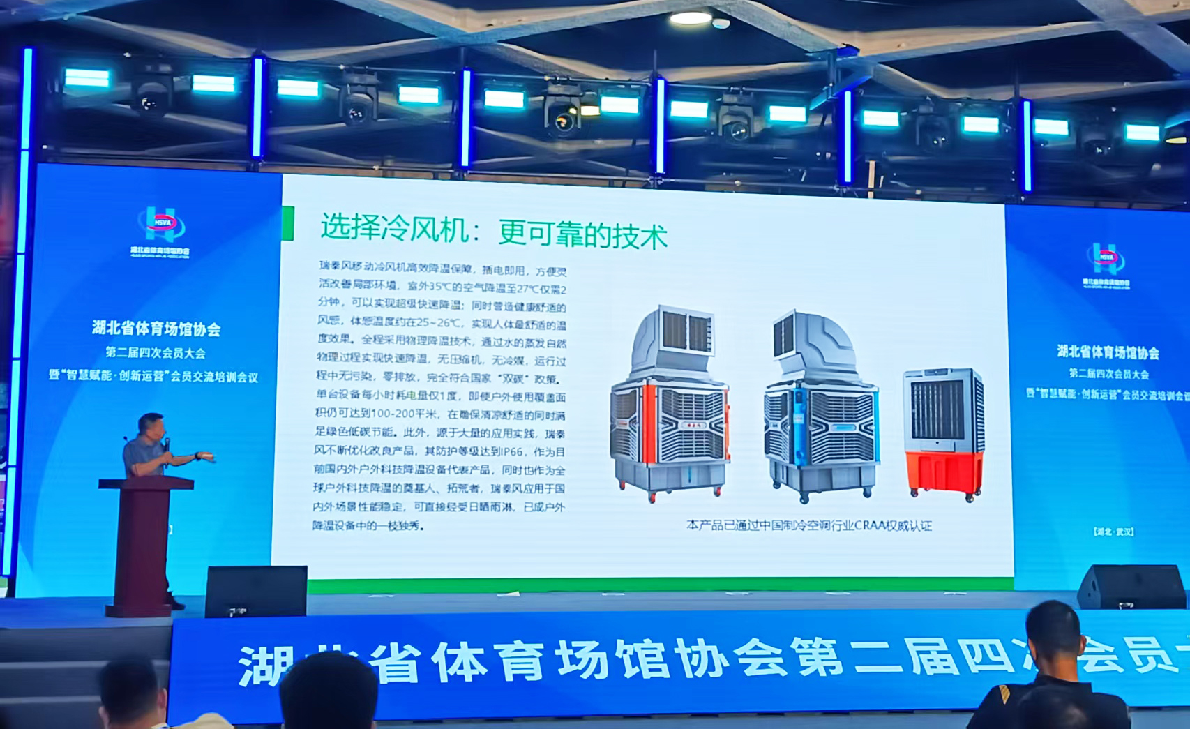 瑞泰風(fēng)移動(dòng)冷風(fēng)機(jī)的生產(chǎn)廠家,瑞泰風(fēng)受邀以分享嘉賓的身份,在現(xiàn)場(chǎng)面向全體參會(huì)嘉賓做了場(chǎng)館應(yīng)用創(chuàng)新主題案例的精彩分享,贏得了全場(chǎng)好評(píng),與行業(yè)同仁共話體育場(chǎng)館運(yùn)營(yíng)創(chuàng)新與發(fā)展。瑞泰風(fēng)市場(chǎng)營(yíng)銷部總經(jīng)理黃劍,重點(diǎn)分享了瑞泰風(fēng)在漢超聯(lián)賽中的降溫保障經(jīng)驗(yàn)。