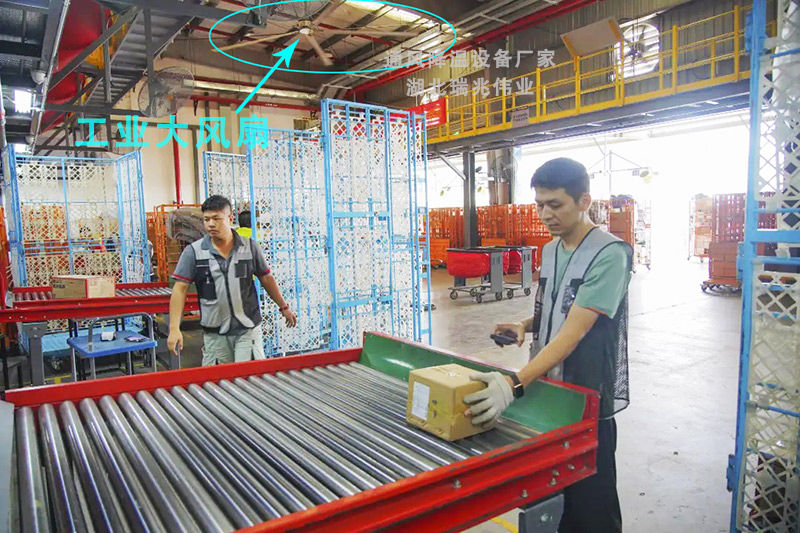 由于業(yè)務(wù)量大,順豐快運(yùn)的各個(gè)電商倉(cāng)儲(chǔ)分揀中心、物流轉(zhuǎn)運(yùn)中心都是高大型的構(gòu)結(jié)構(gòu)廠房,因此面積都比較大,加上里面大型的分揀設(shè)備、儲(chǔ)存的物品,整個(gè)空間是非常密集的,一般的通風(fēng)降溫設(shè)備,在這個(gè)密集的空間里可能都無(wú)法擺放。好在順豐速運(yùn)選擇了我們的瑞泰風(fēng)工業(yè)大風(fēng)扇,它安裝于高空,不占用一點(diǎn)地面空間,并且它的風(fēng)量大,一臺(tái)