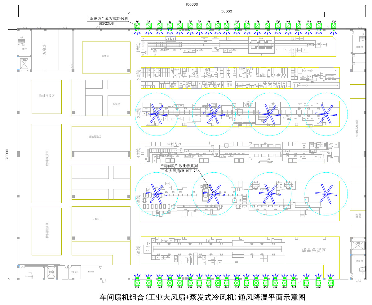2、沒有冷風(fēng)機(jī),大風(fēng)扇對(duì)人員進(jìn)行感官降溫沒問題,但并不能將環(huán)境溫度處理的很好,而沒有大風(fēng)扇,僅使用冷風(fēng)機(jī)時(shí)又必須要設(shè)置大量送風(fēng)管道吊掛于室內(nèi)屋面以下,影響空間美觀性與建筑安全,推高了投資成本,唯有扇機(jī)組合才能得以兼顧。