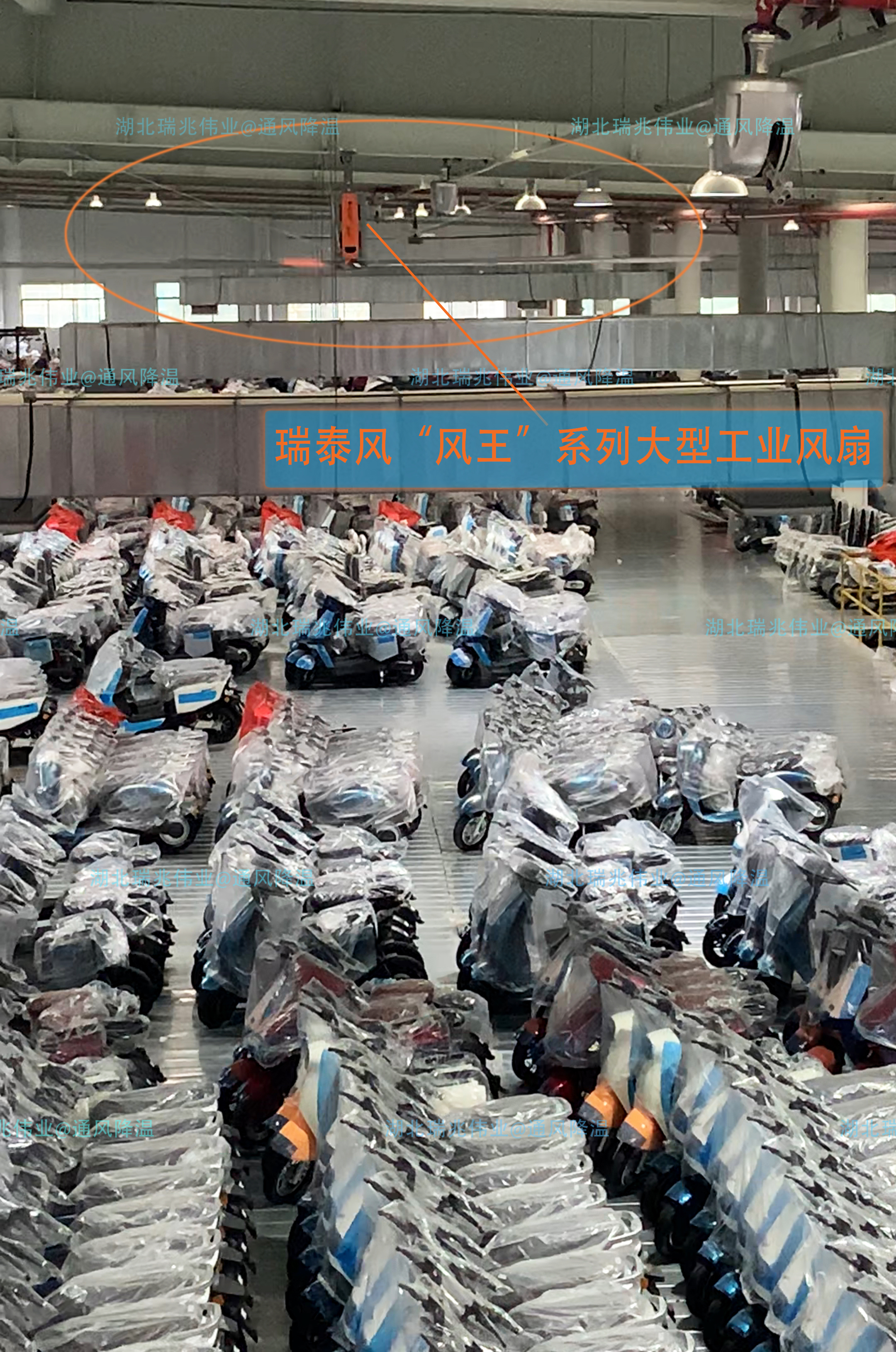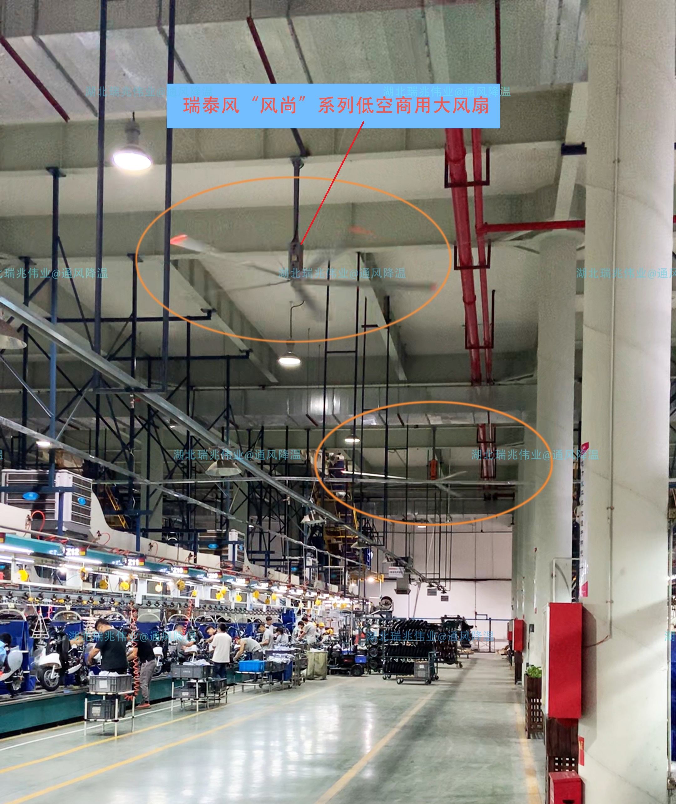 大型工業(yè)風(fēng)扇對電動車廠房進(jìn)行整體通風(fēng)降溫。 生產(chǎn)區(qū)域由于空高偏低,人員相對比較密集,我們設(shè)計了瑞泰風(fēng)“風(fēng)尚”系列低空商用大風(fēng)扇,對工作區(qū)域人員進(jìn)行區(qū)域內(nèi)整體送風(fēng)降溫。瑞泰風(fēng)“風(fēng)尚”系列低空商用大風(fēng)扇單臺風(fēng)量為9000立方米的,是專門為低空場所設(shè)計的一款大風(fēng)扇。它的風(fēng)速均勻、風(fēng)量大小適中,帶給崗位工作人員自然風(fēng)吹拂的體感。