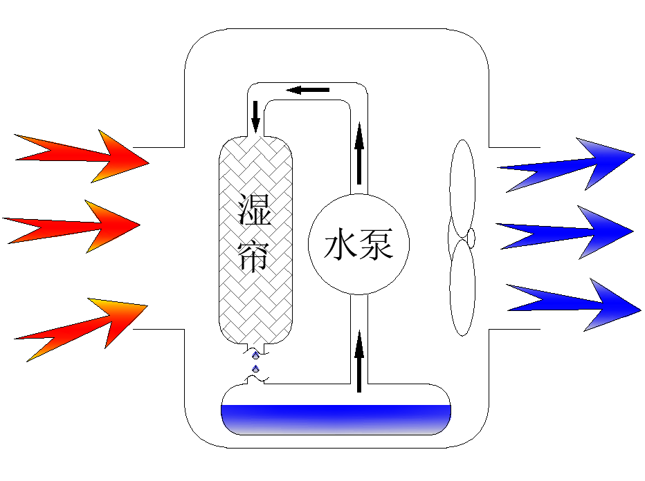 蒸發(fā)式冷氣機(jī)機(jī)組工作時,首先是由水泵將底盤中的水抽到布水器,然后由布水器均勻的把水分布到蒸發(fā)濕簾頂部。水隨即淋濕整個蒸發(fā)濕簾的接觸面積,最后回到底盤。當(dāng)風(fēng)機(jī)工作時,外面的新鮮空氣被迫從蒸發(fā)濕簾中經(jīng)過,濕簾表面的水蒸發(fā)吸收空氣中的熱量。此時從機(jī)組送出來的冷空氣,就是經(jīng)過增濕降溫處理過的新鮮冷氣。蒸發(fā)式冷氣機(jī)結(jié)構(gòu)及降溫原理可見下圖: