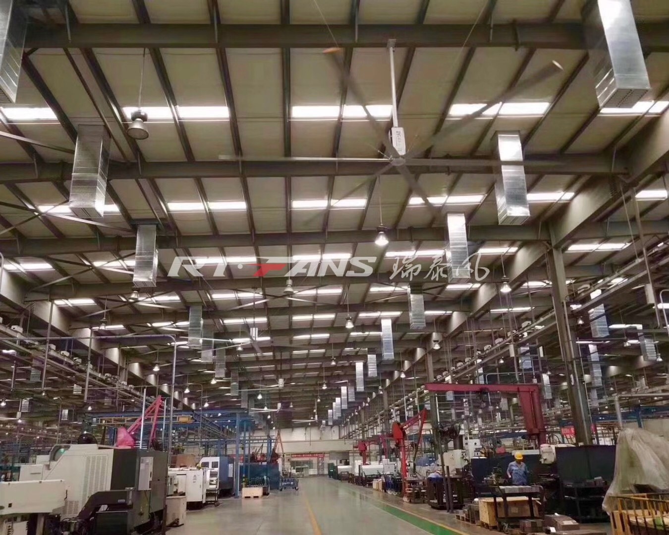 瑞泰風(fēng)工業(yè)大風(fēng)扇與瑞泰風(fēng)冷風(fēng)機(jī)相互配合下,能快速給廠房車間通風(fēng)降溫。利用瑞泰風(fēng)冷風(fēng)機(jī)大風(fēng)量特點(diǎn),迅速有效排出室內(nèi)人員、機(jī)器產(chǎn)生的熱氣、廢氣、異味,避免了熱氣、廢氣長(zhǎng)時(shí)間停留在室內(nèi)對(duì)人體的刺激。整個(gè)室內(nèi)空氣最快可以在一分鐘內(nèi)更換一次,這是一般其它通風(fēng)降溫設(shè)備所無法達(dá)到的效果。